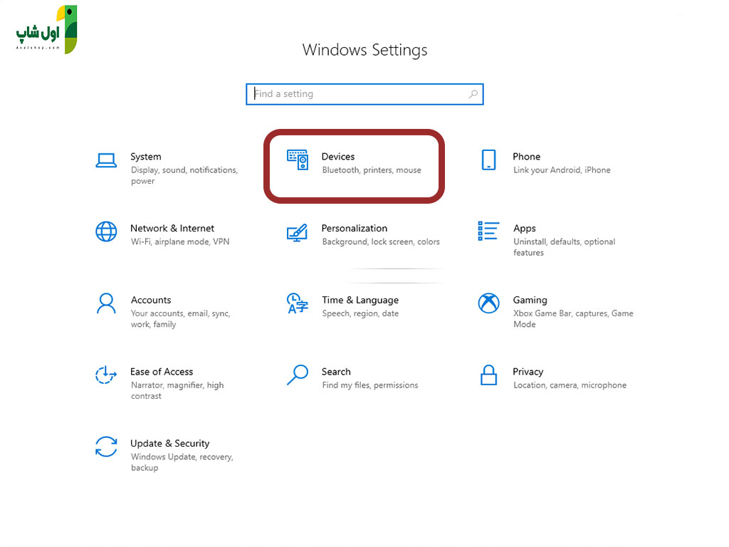 3. در ویندوز لپ تاپ یا سیستم خود وارد قسمت تنظیمات شوید و قسمت devices را انتخاب نمایید.